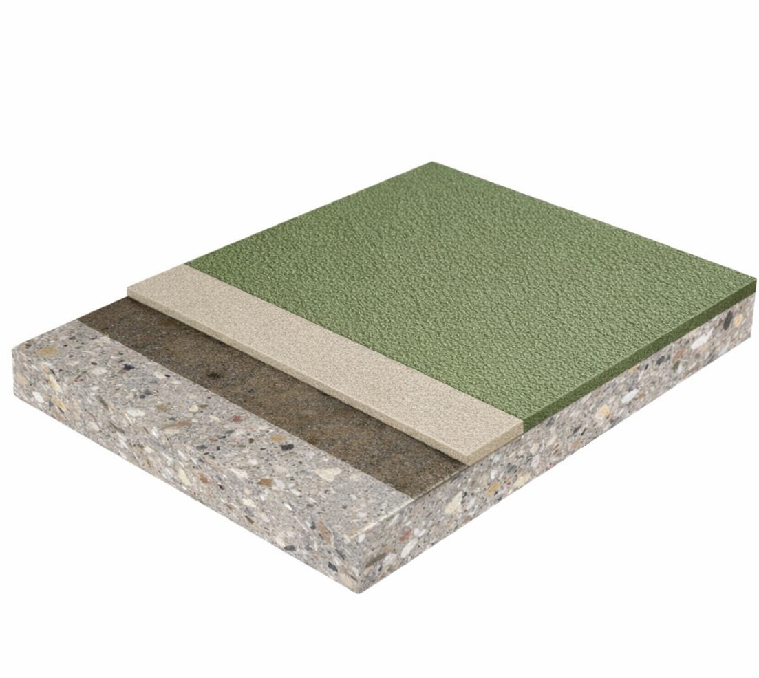 Полимерное высоконаполненное покрытие на основе эпоксидных смол, шероховатое, с окрасочным цветным финишным слоем, толщиной 2,0мм.